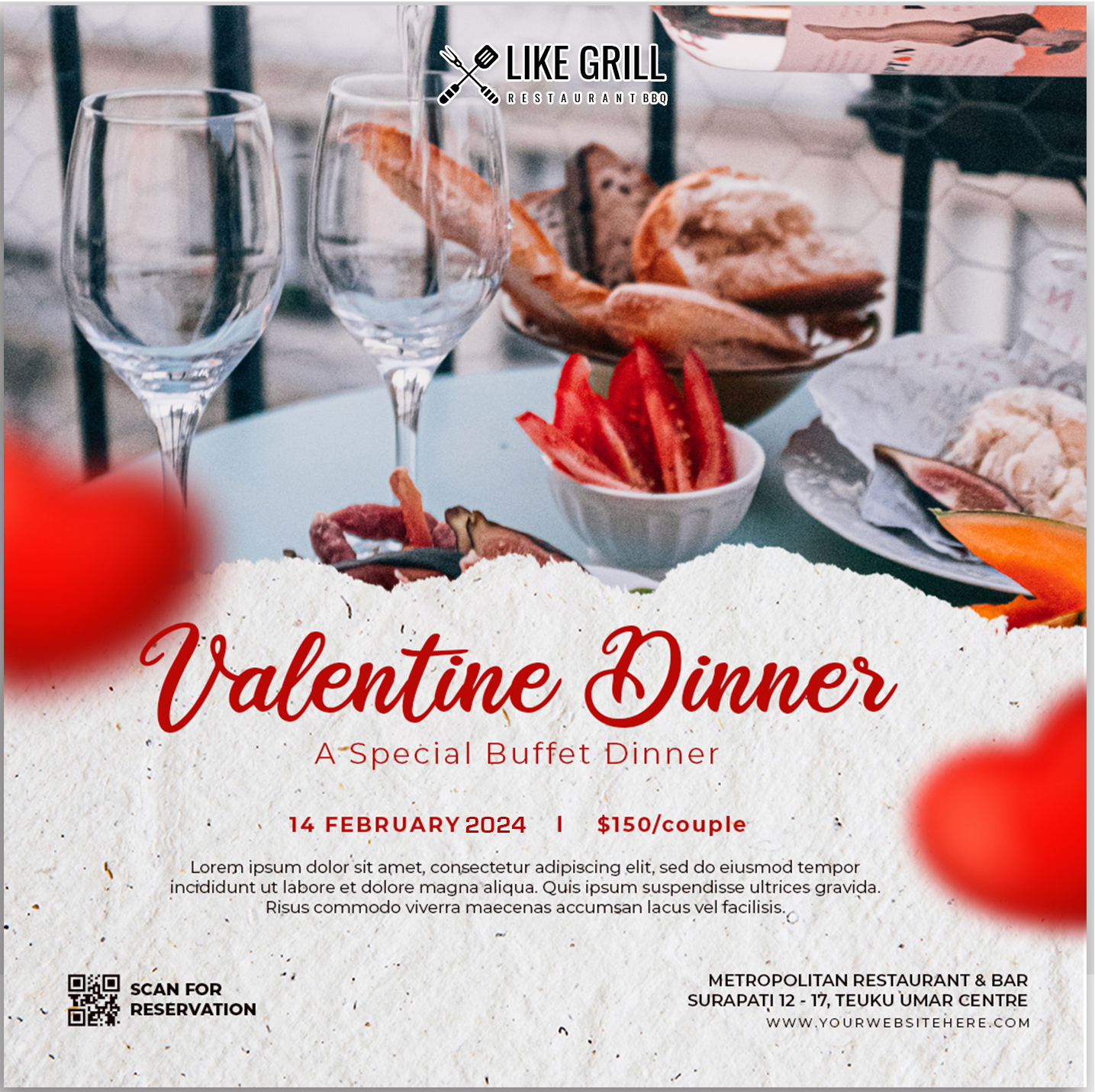 DescriptionJoin us on Wednesday, February 14, 2024, for a sumptuous live grill three-course dinner at $85.00* per individual. Opt for our special couple's offer at $150 with a ticket. A delightful children's menu and a selection of à la carte options are also at your disposal. For further details and to secure your reservation, kindly contact us at (123) 456-7890.